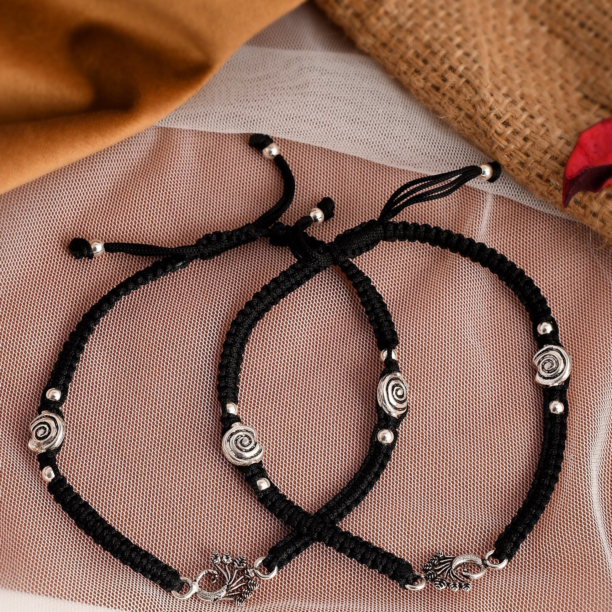 This anklet is made in 925 pure silver with a peacock motif and round silver beads assembled in black cotton thread.