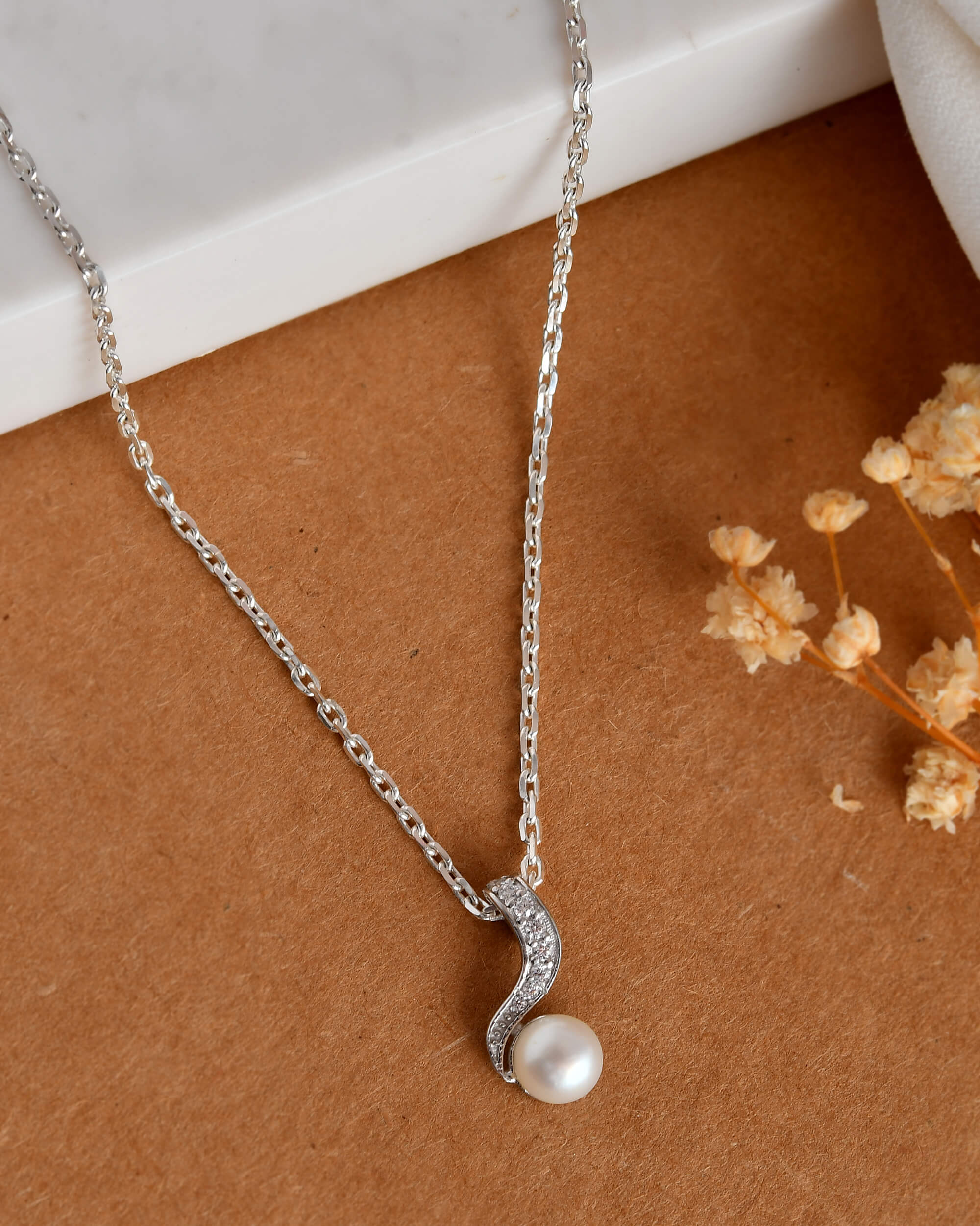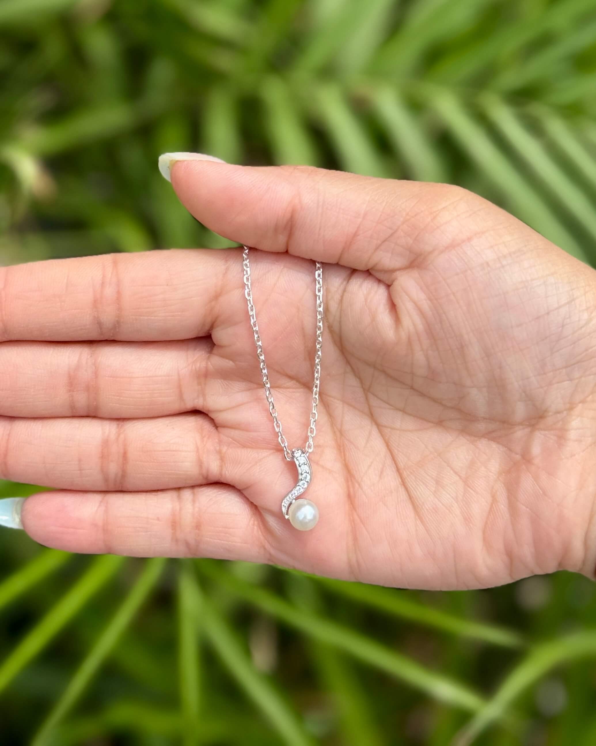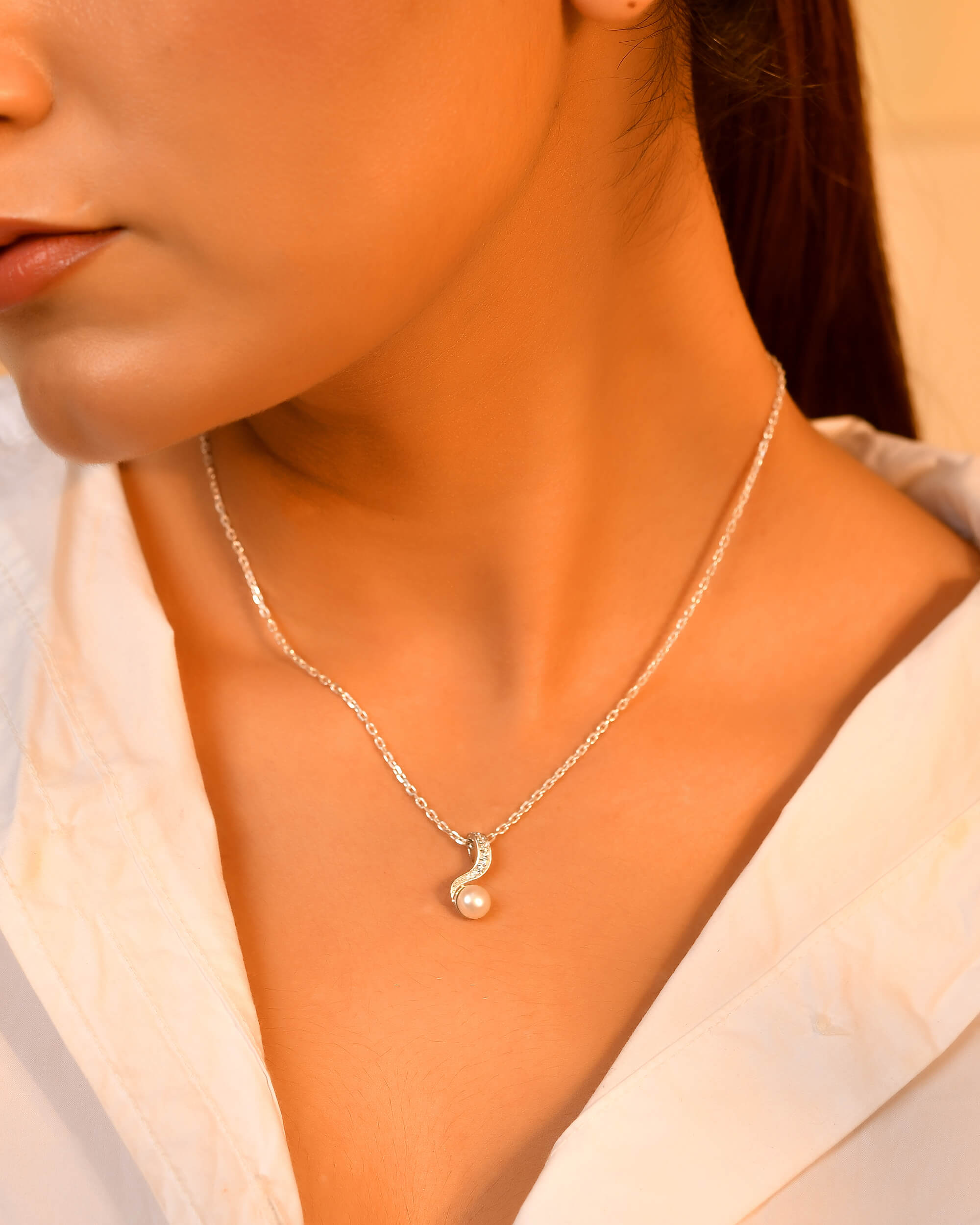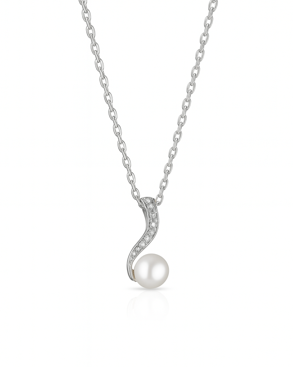 A modern twist of silver curves ending in a luminous pearl—minimal, graceful, and versatile.