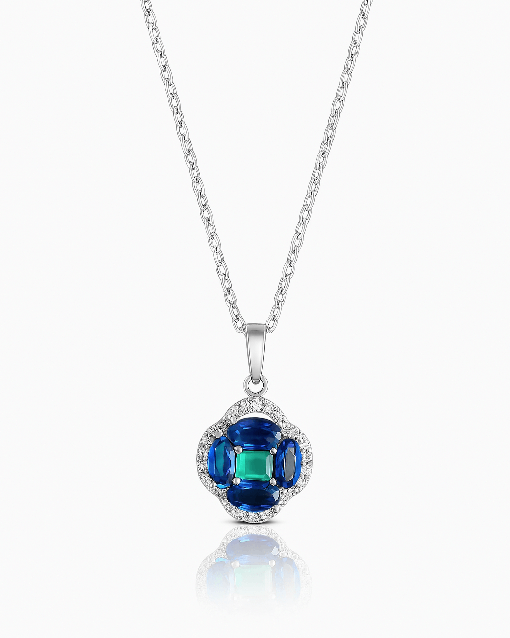 A striking combination of royal blue and emerald green stones in a regal floral cluster—bold yet classy.