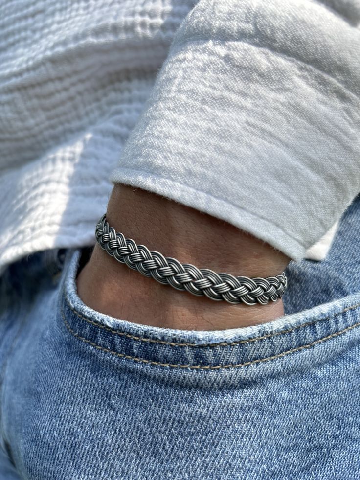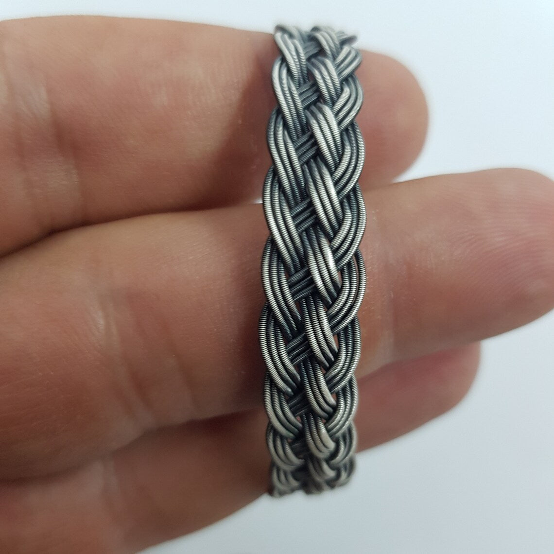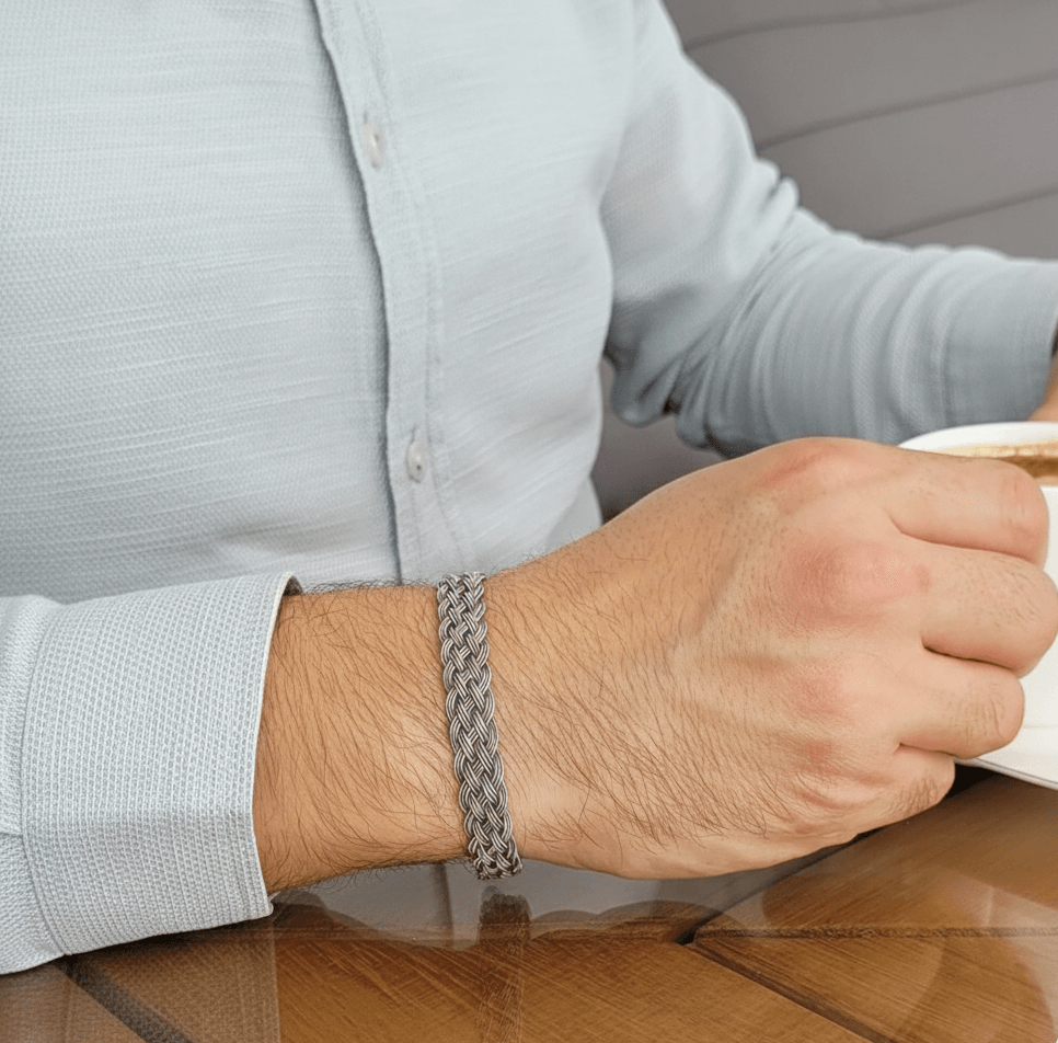 Crafted in authentic Turkish style, this handwoven bracelet showcases the artistry of traditional metalwork. Fashioned from 95% silver, each piece features intricate interlocking patterns that catch light beautifully, creating subtle dimension on the wrist. The meticulous handweaving technique ensures no two bracelets are identical, making this a distinctive accessory for those who appreciate heritage craftsmanship and timeless elegance.