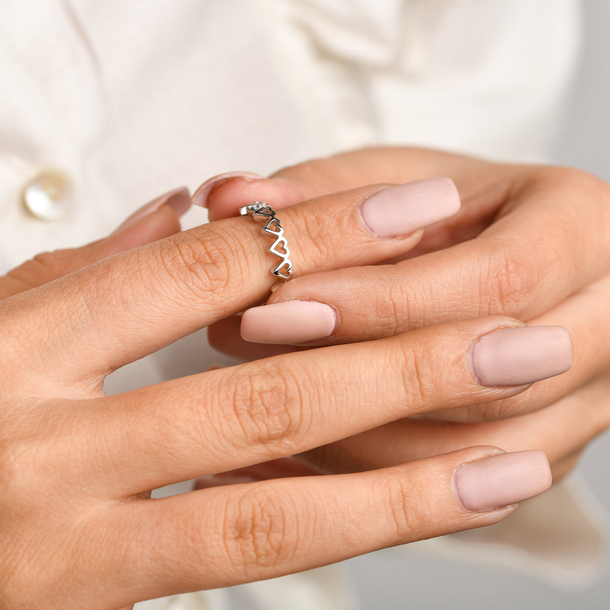 this band features heart carved design on 92.5 sterling silver, wear it alone or stack it with more