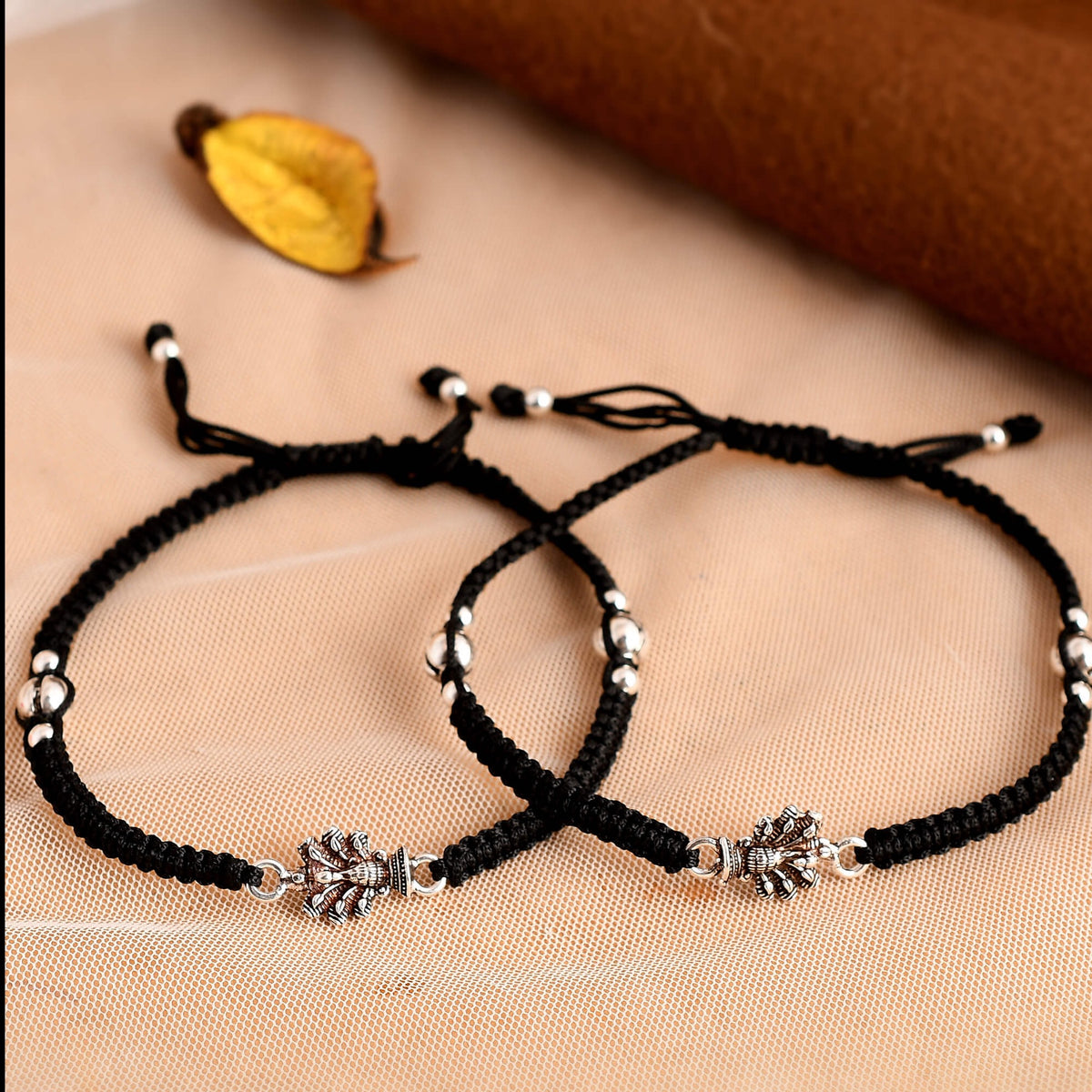 This anklet is made in 925 pure silver with a motif at centre and round silver beads assembled in black cotton thread.