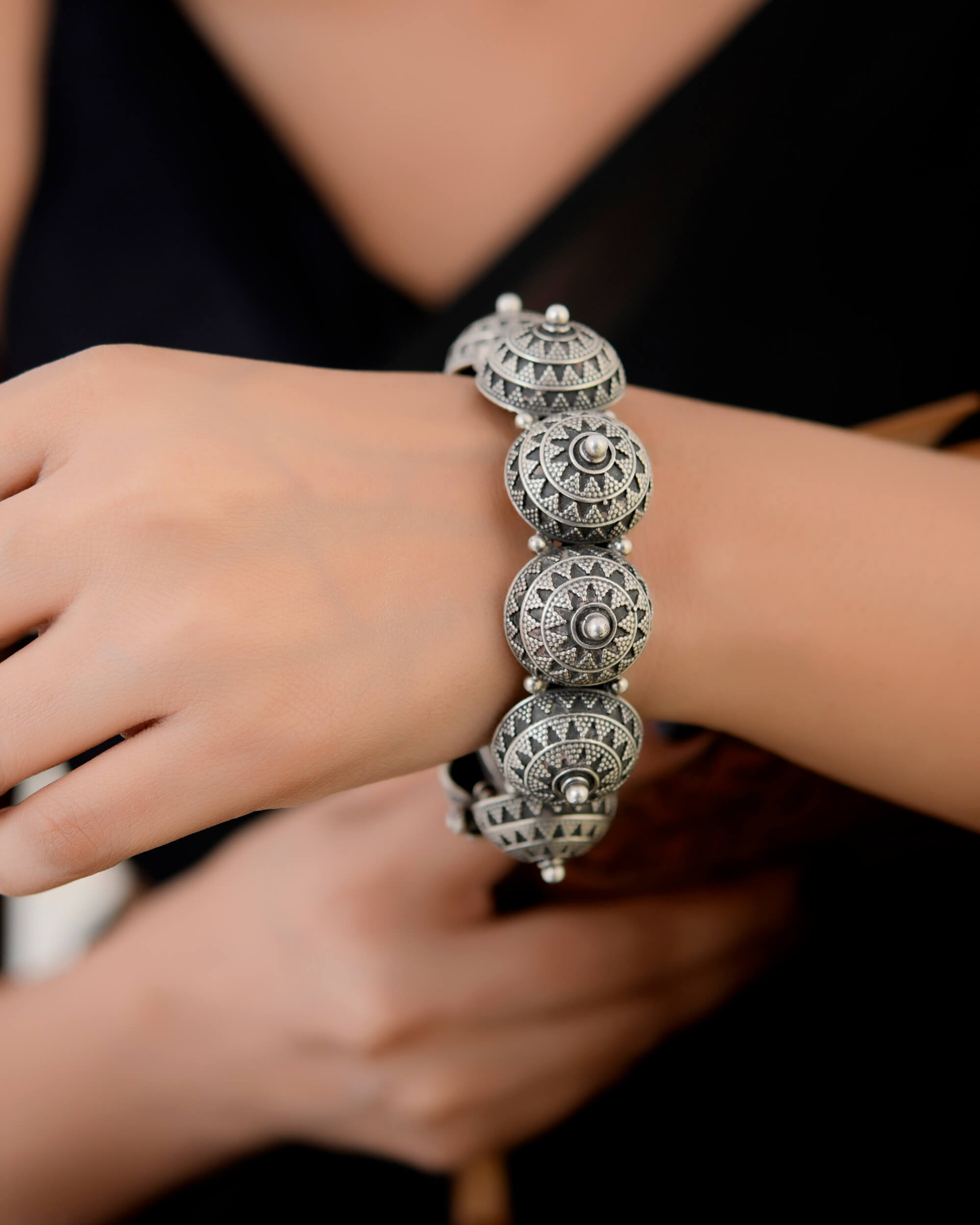 Expertly crafted with premium quality silver, this Anvika bangle boasts a unique design that sets it apart. Each piece is carefully made to ensure the highest level of craftsmanship, resulting in a sophisticated and stylish accessory for any occasion. Elevate your look with this exquisite bangle.