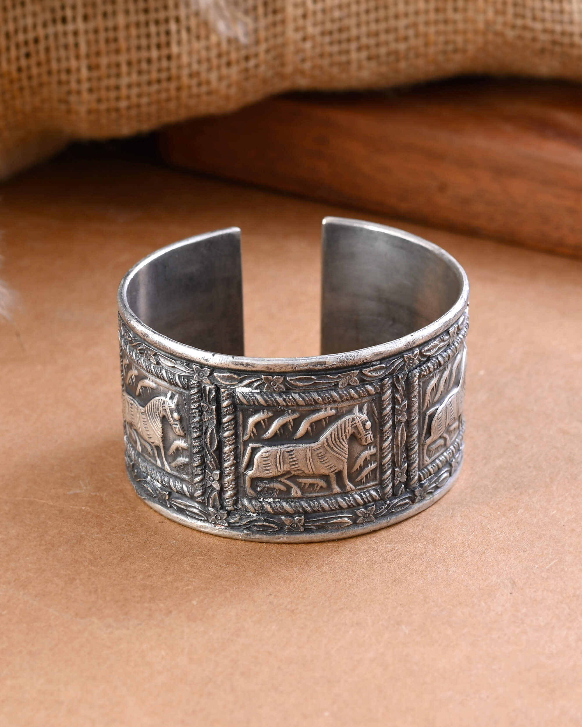 Crafted with the highest quality materials, the Charulata Silver Bangle boasts a one-of-a-kind design that is sure to make a statement. With its premium construction and distinctive design, this bangle exudes elegance and sophistication. Elevate your style with Charulata.
