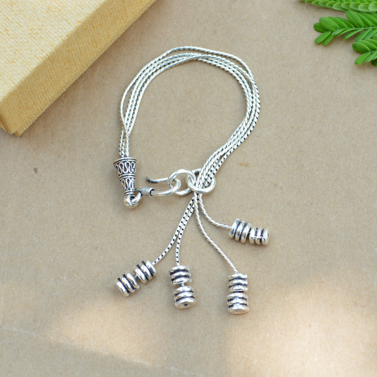This bracelet has hook that makes it adjustable for every wrist. The motives hanging below gives a unique look.