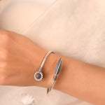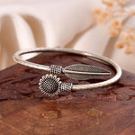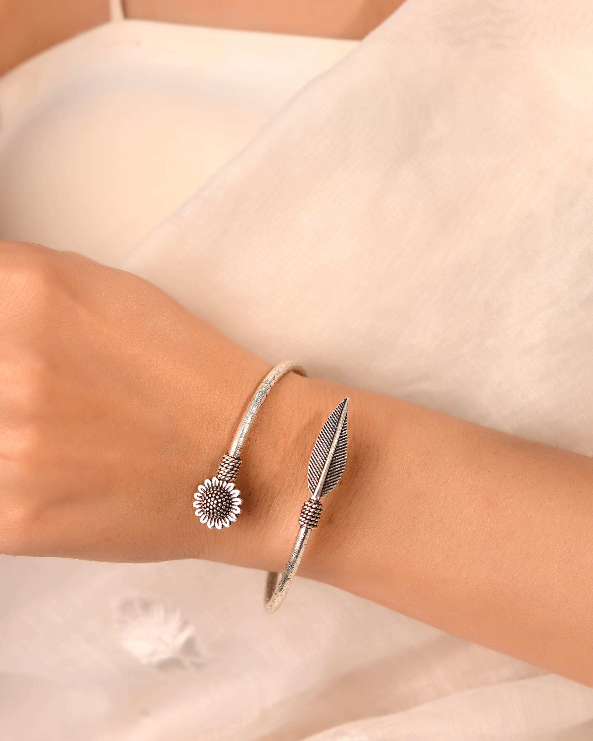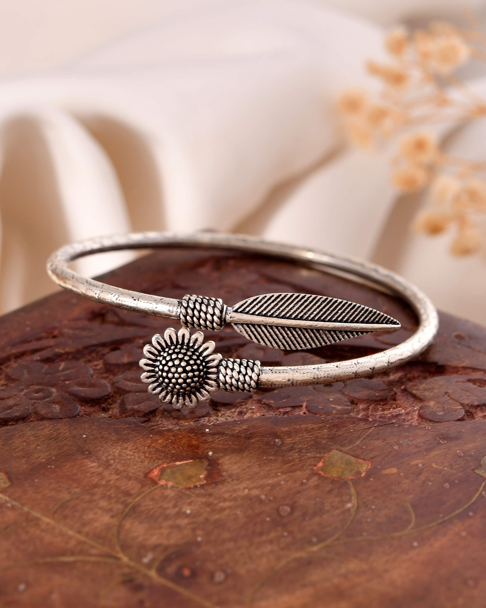 This oxidised silver bangle features a charming sunflower on one end and a detailed feather on the other. Artistic, bohemian, and easy to style.