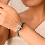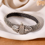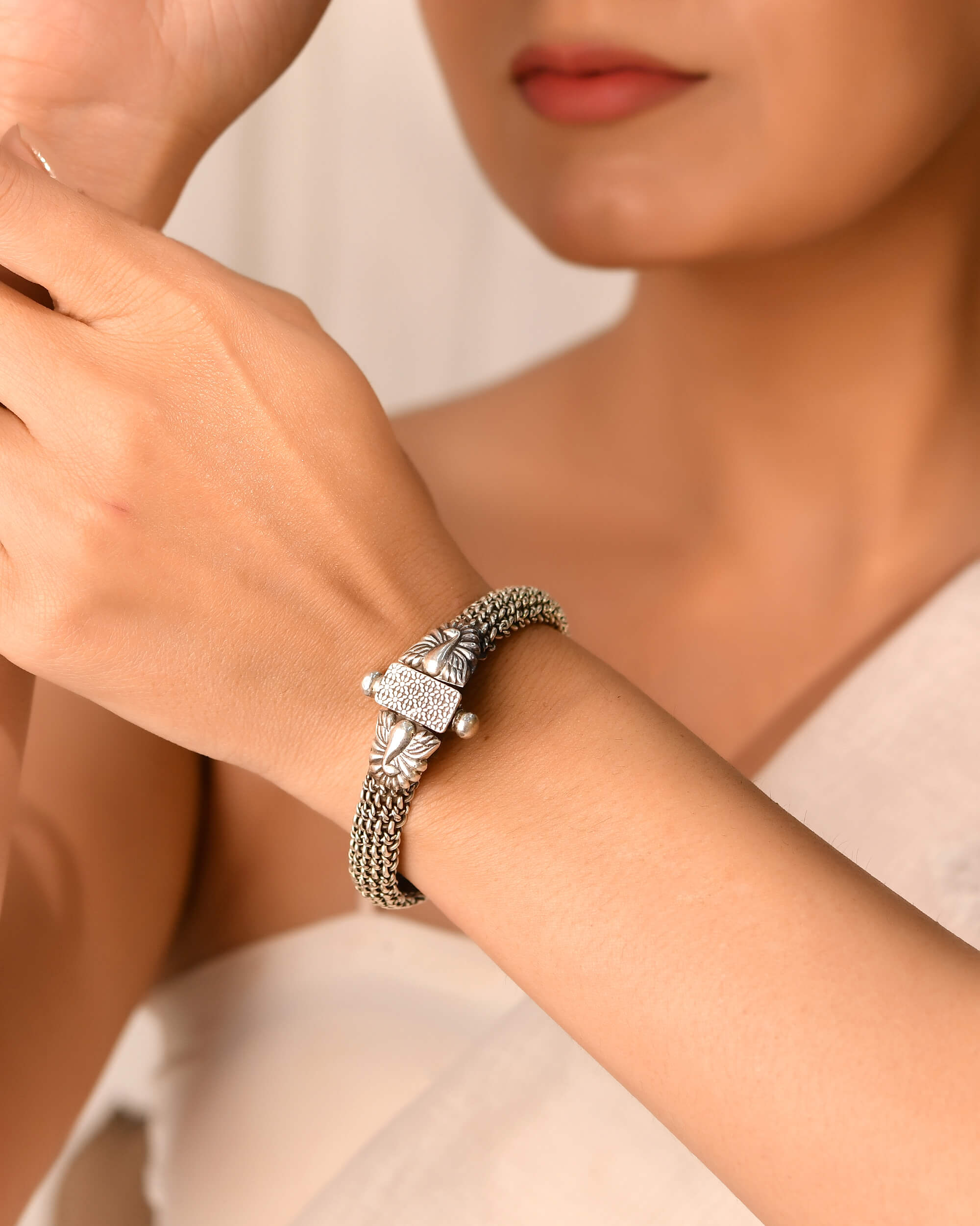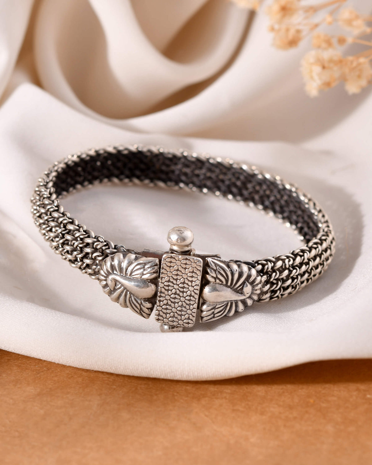 Crafted with a dense woven mesh design, this piece blends strength with elegance. Finished with oxidised detailing and a sturdy clasp for everyday luxury.