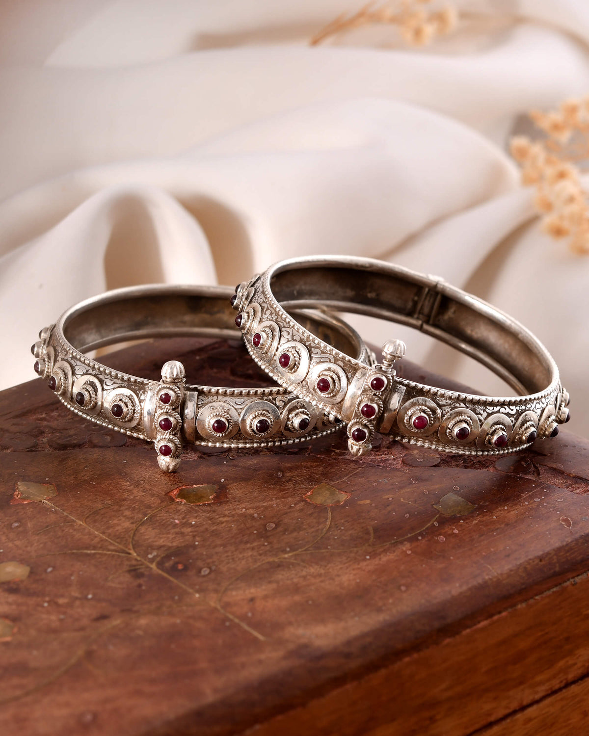 Traditional broad kadas featuring carved circular motifs and Red-coloured stones. A regal pair that enhances festive and ethnic looks.