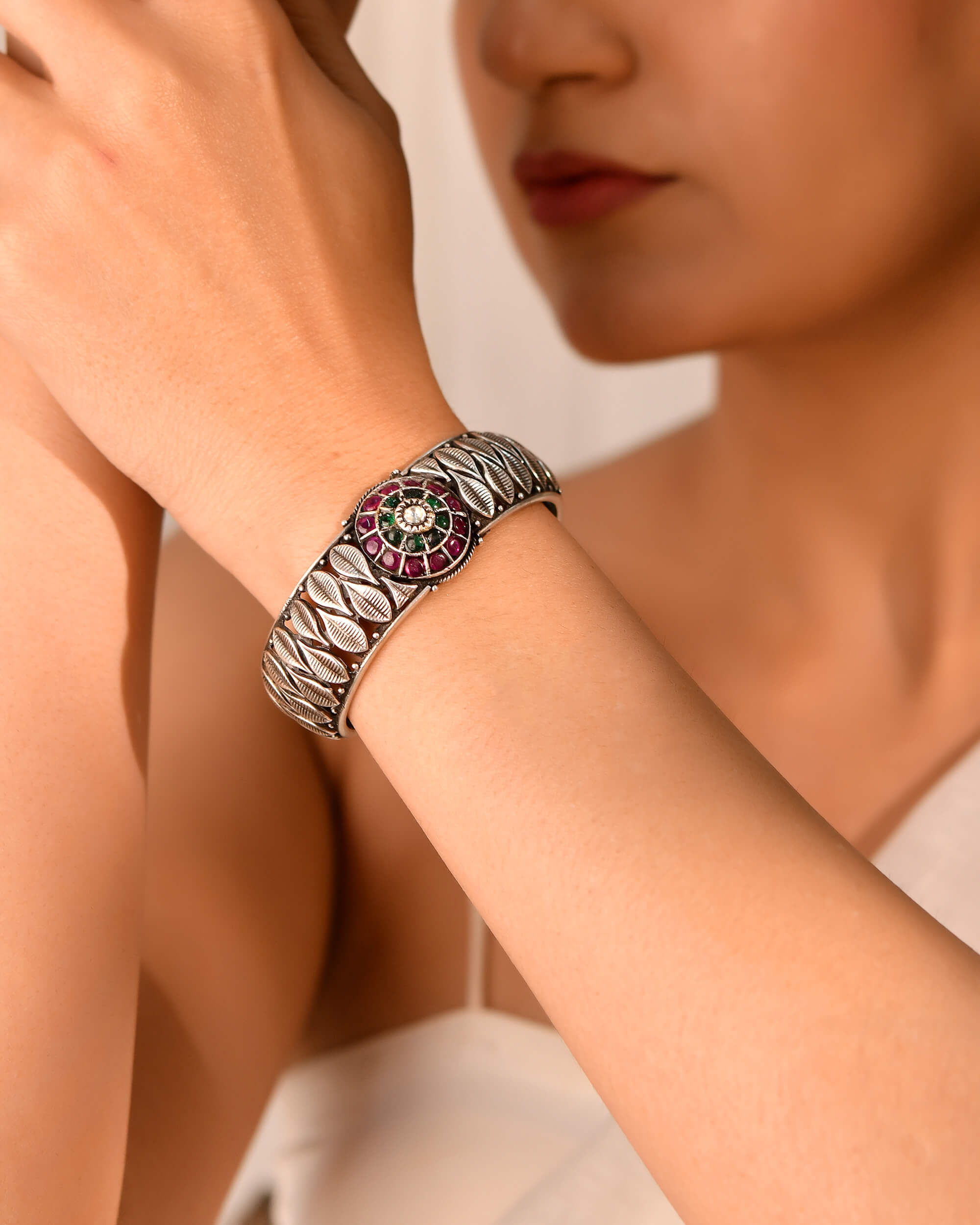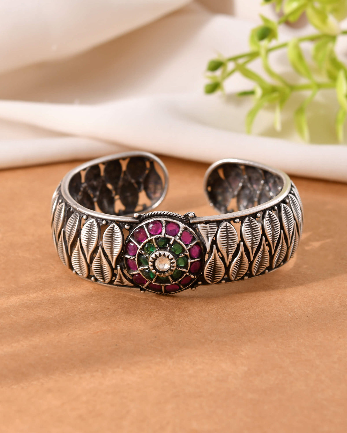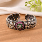Bold Patta Patta (leaf) texture oxidized silver Bangle. Features a vibrant central flower medallion set with Red stones. A handcrafted statement cuff perfect for Boho-chic and tribal jewelry lovers.