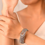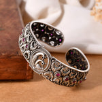 Regal Mayur Jaal oxidized silver cuff. Handcrafted with intricate filigree, showcasing a stunning peacock motif and lavish ruby accents. This wide statement bangle is perfect for festive and ethnic wear. Ideal for buyers seeking high-quality antique-look silver jewelry.