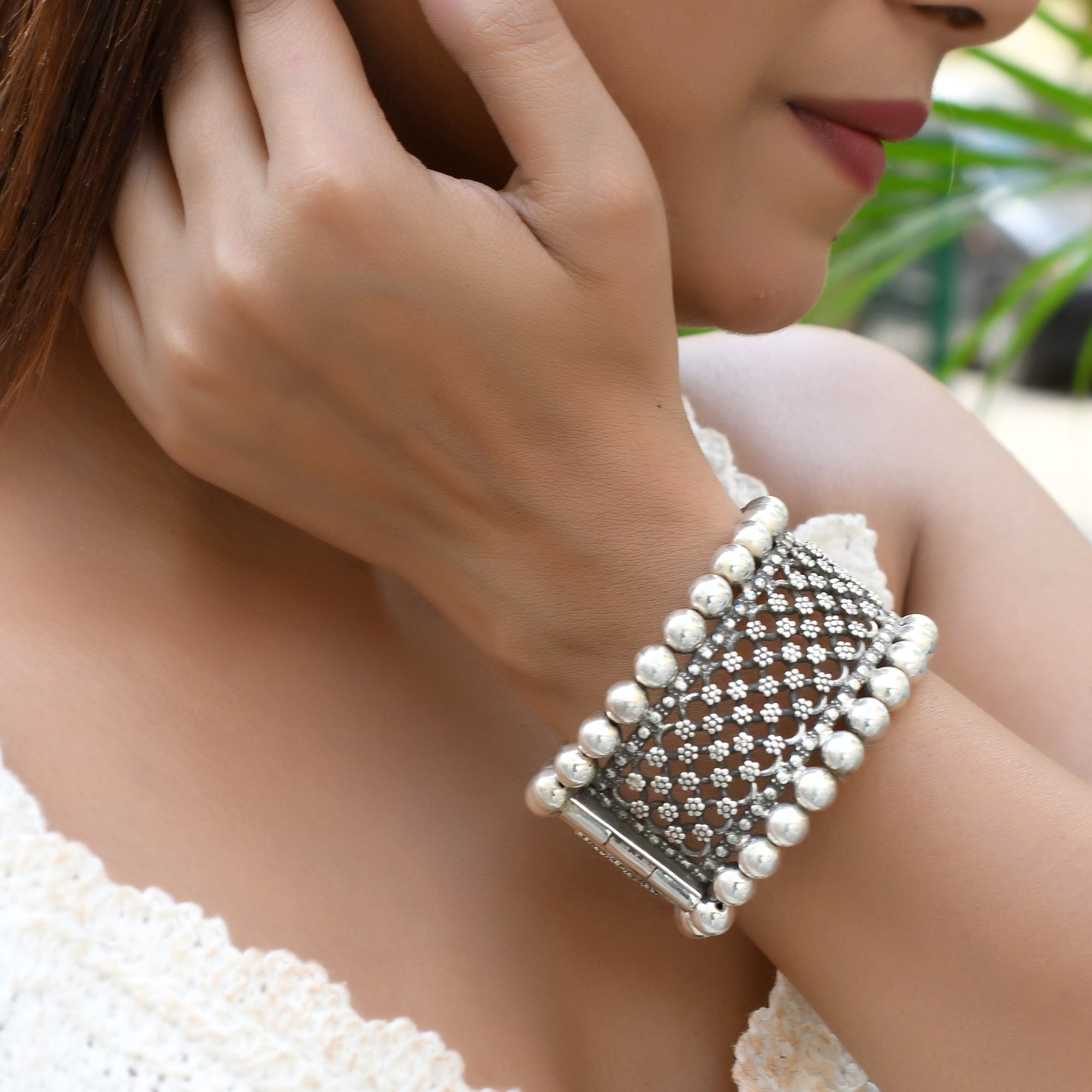 The tribal silver bracelet carries the bold patterns inspired by the traditional motives. The textured surface and the artistic curves reflect the craftsmanship. It pairs amazingly with other Indo Western outfits and adds a touch of cultural richness to everyday.