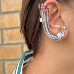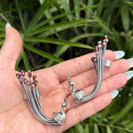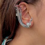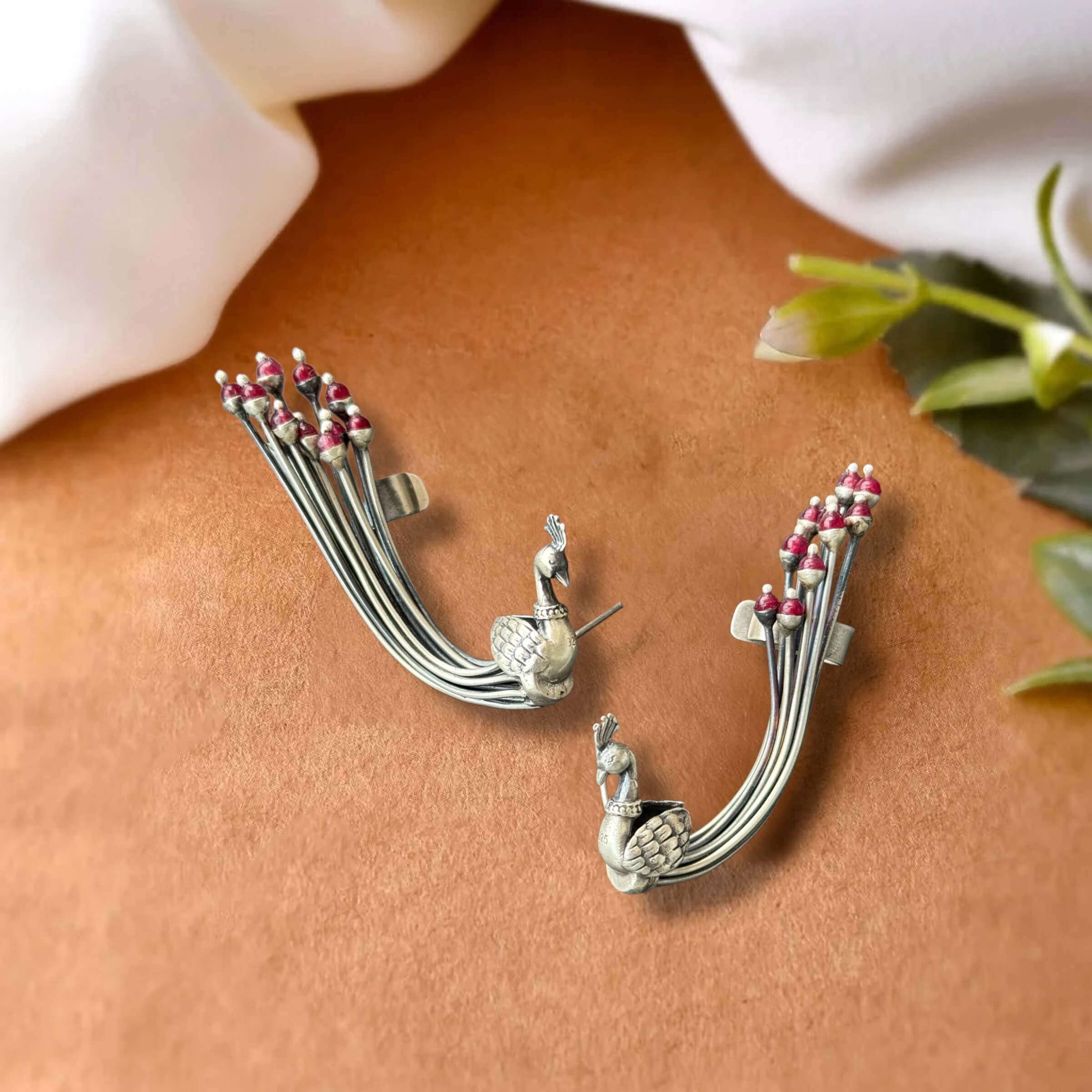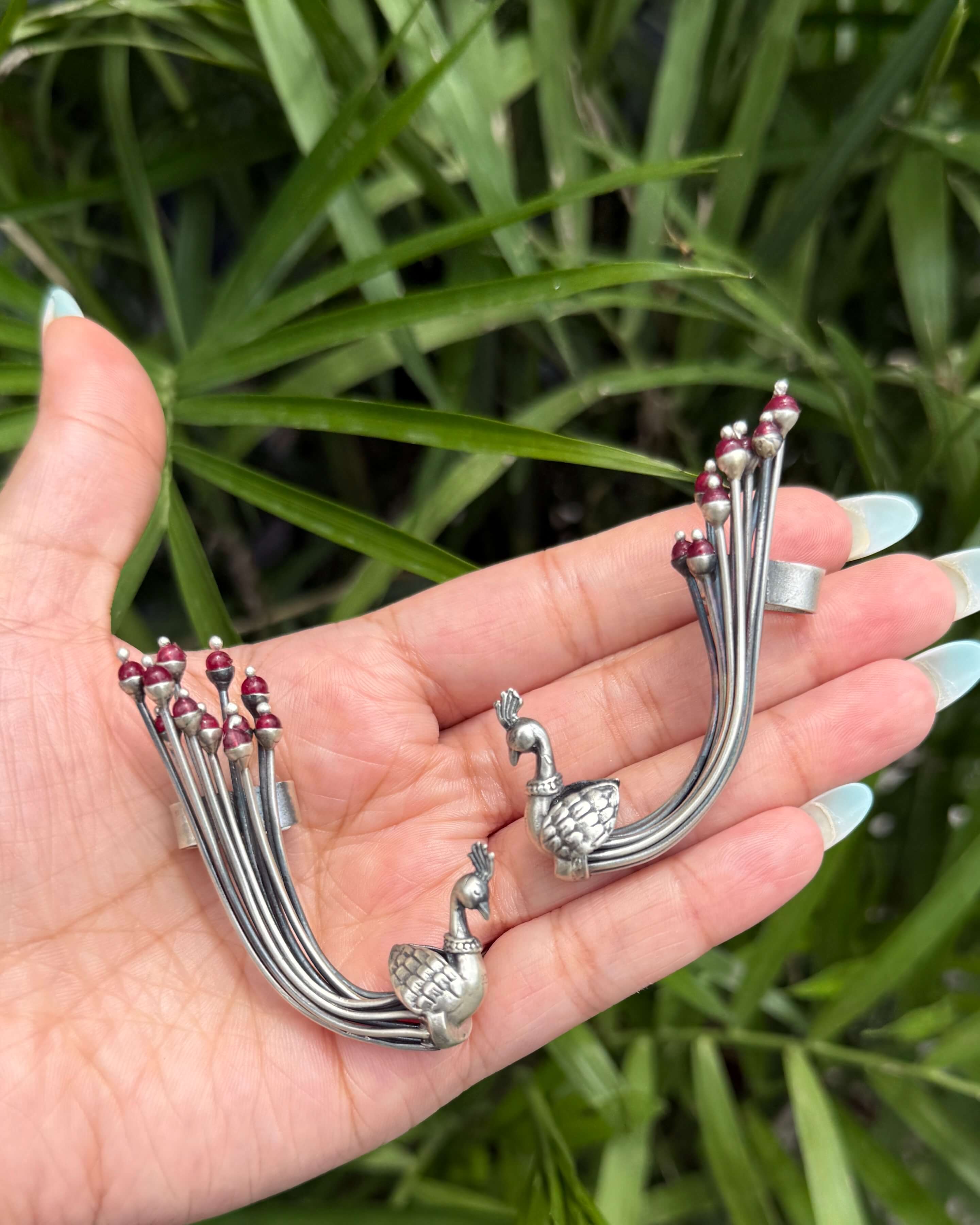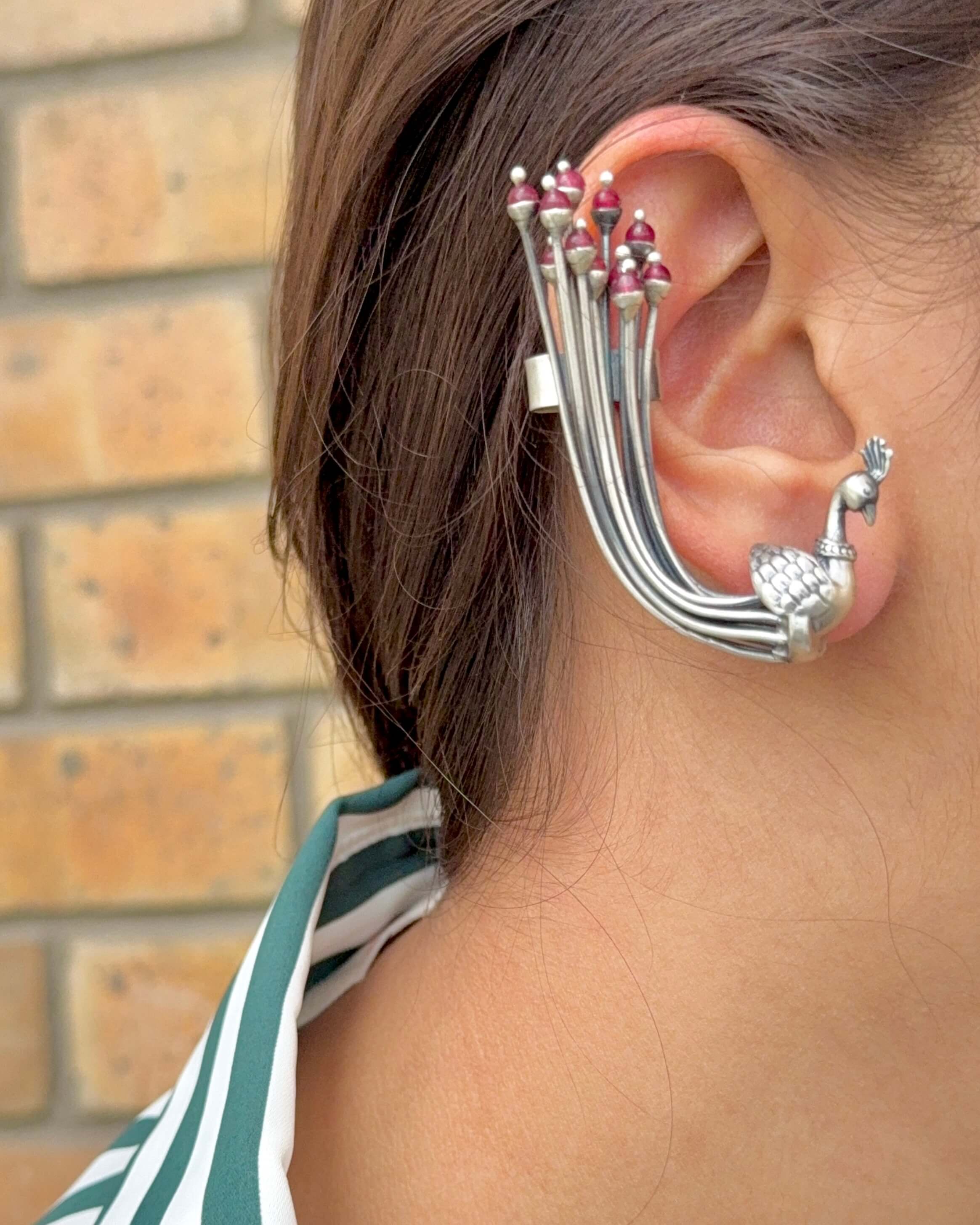 This exquisite peacock ear cuff is crafted from 92.5% sterling silver, featuring delicate red beads accentuating the ends of the intricately designed peacock feather motifs. Its elegant design offers a sophisticated statement piece that enhances any ensemble with a touch of traditional artistry and refined craftsmanship. Perfect for those seeking a unique accessory that combines cultural symbolism with expert silverwork.