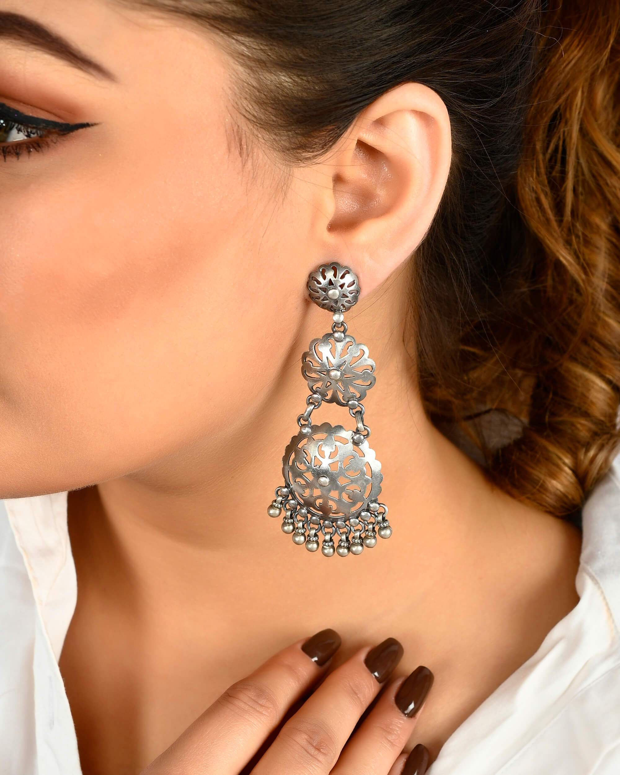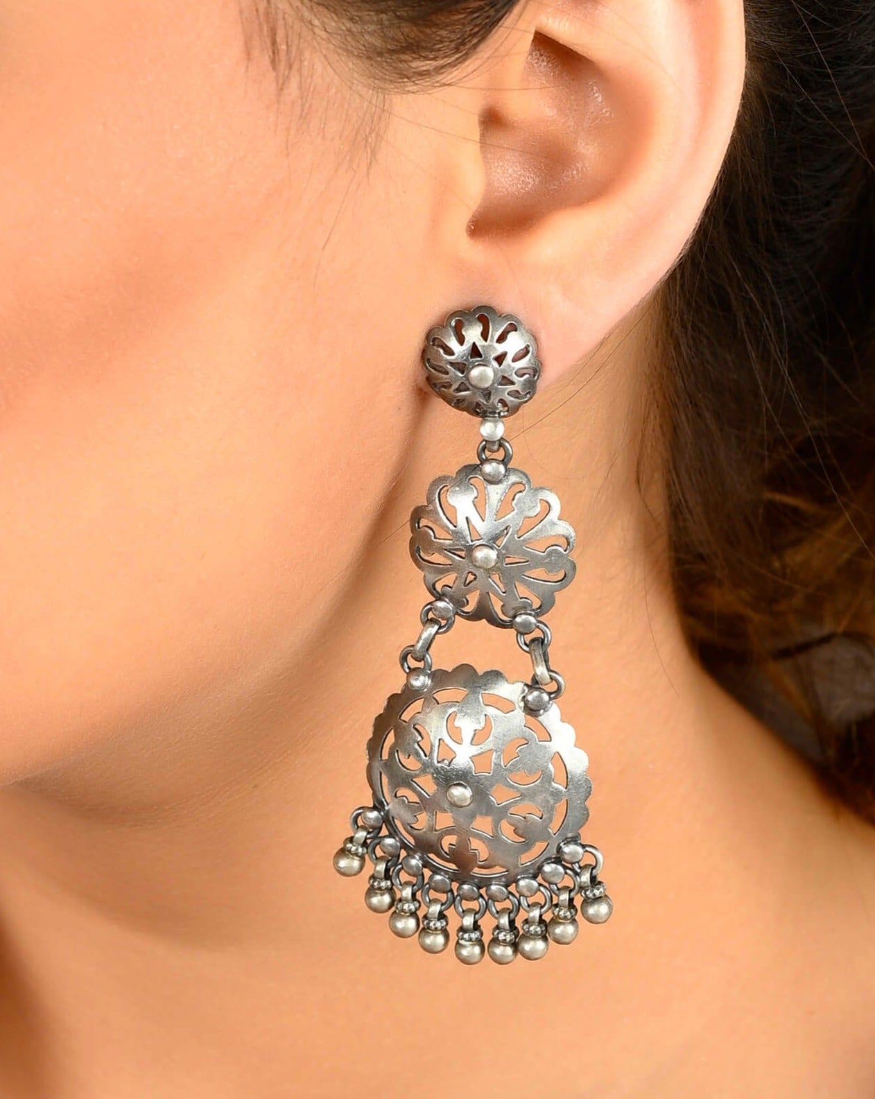 Expertly crafted with premium quality materials, these Arahvi long earrings feature a unique jhumki design. Elevate any outfit with these elegant and timeless earrings. Made to last, these earrings are the perfect statement piece for any occasion.