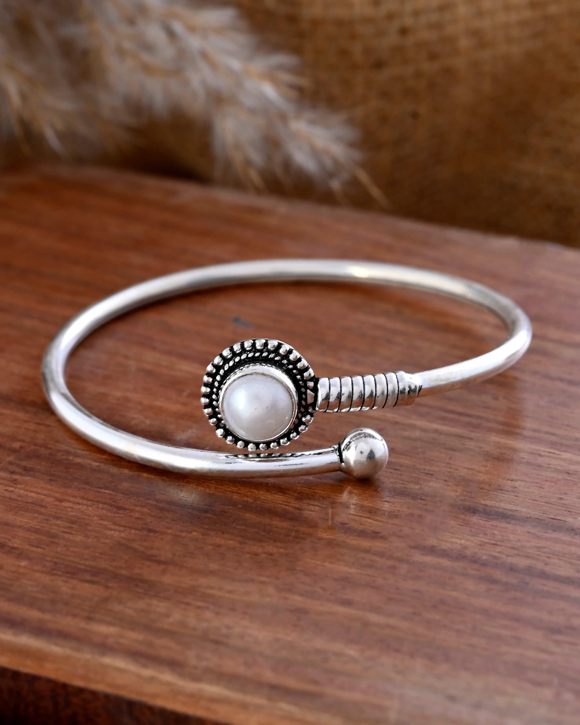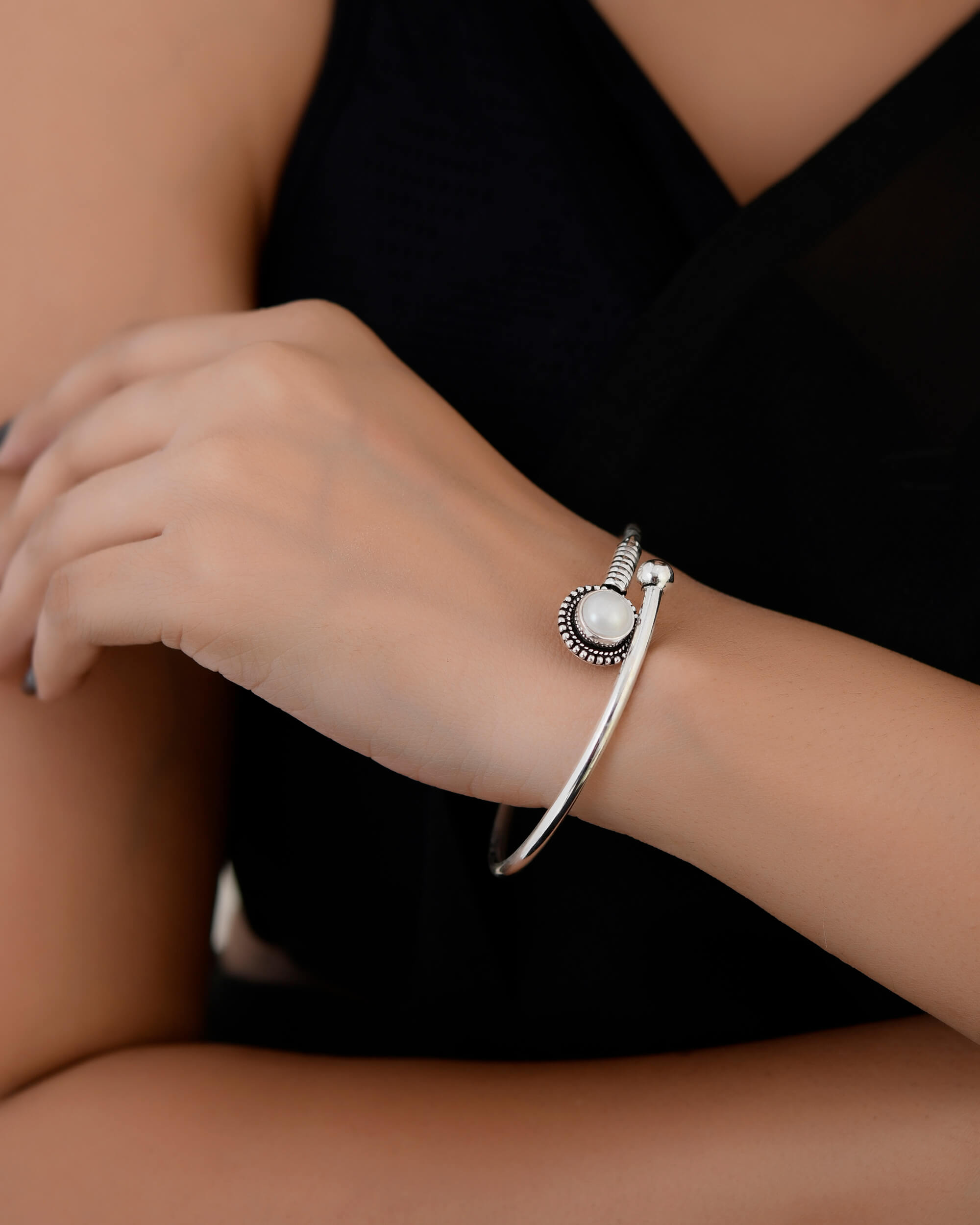 Crafted with premium quality materials, the Gaurika Pearl Silver Bangle boasts a unique design featuring stunning swarovski pearls. Elevate any outfit with this elegant accessory that exudes sophistication.