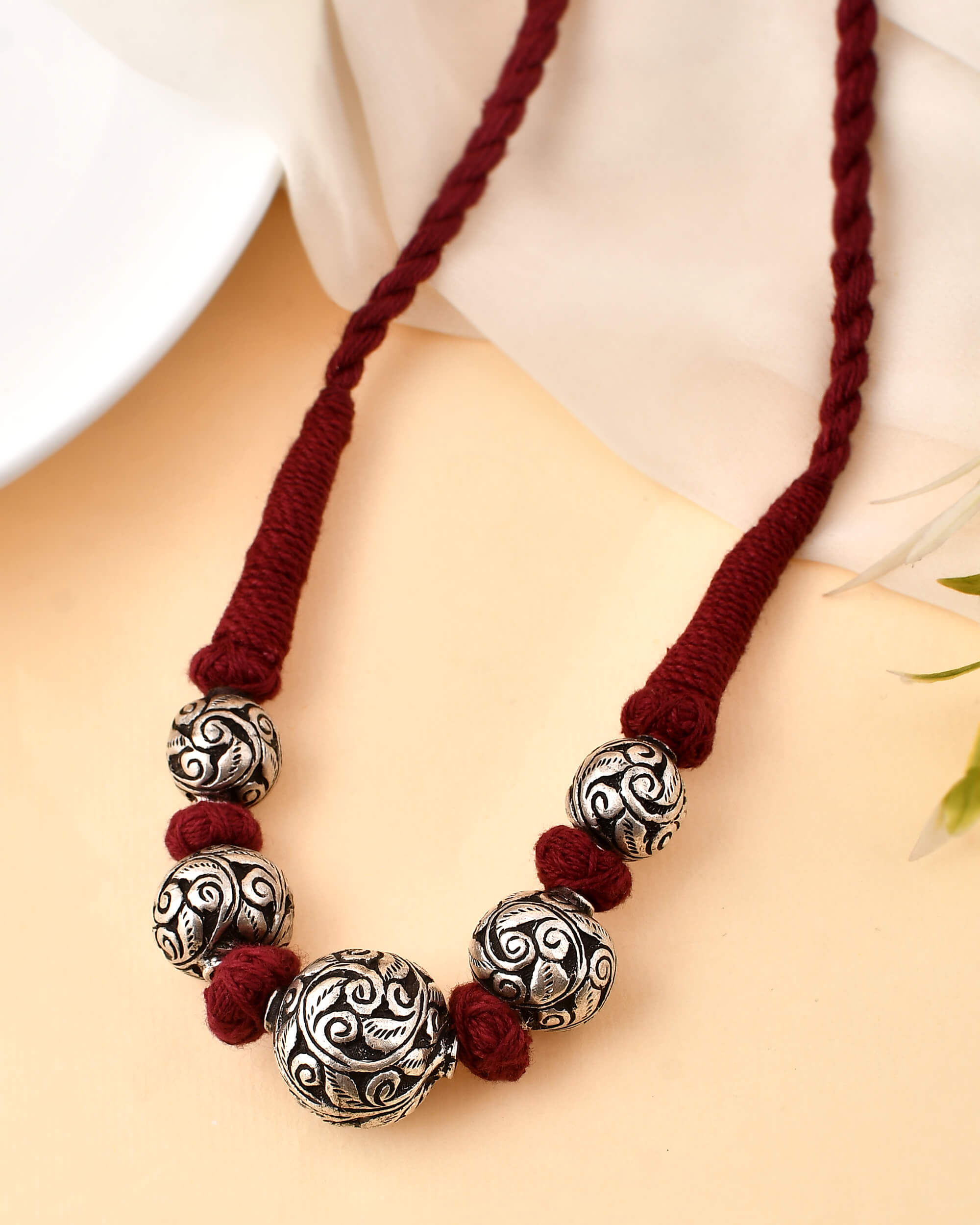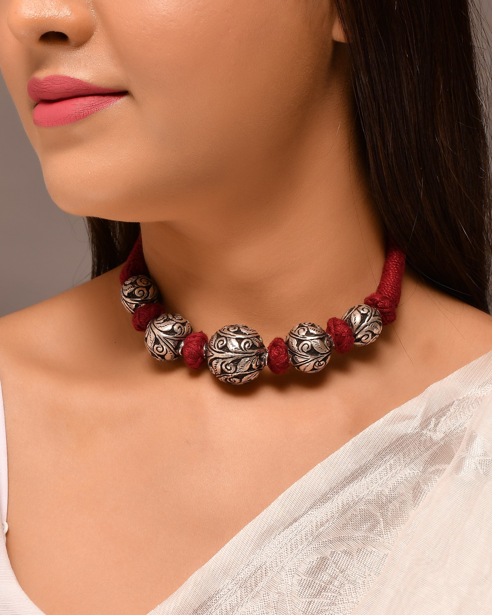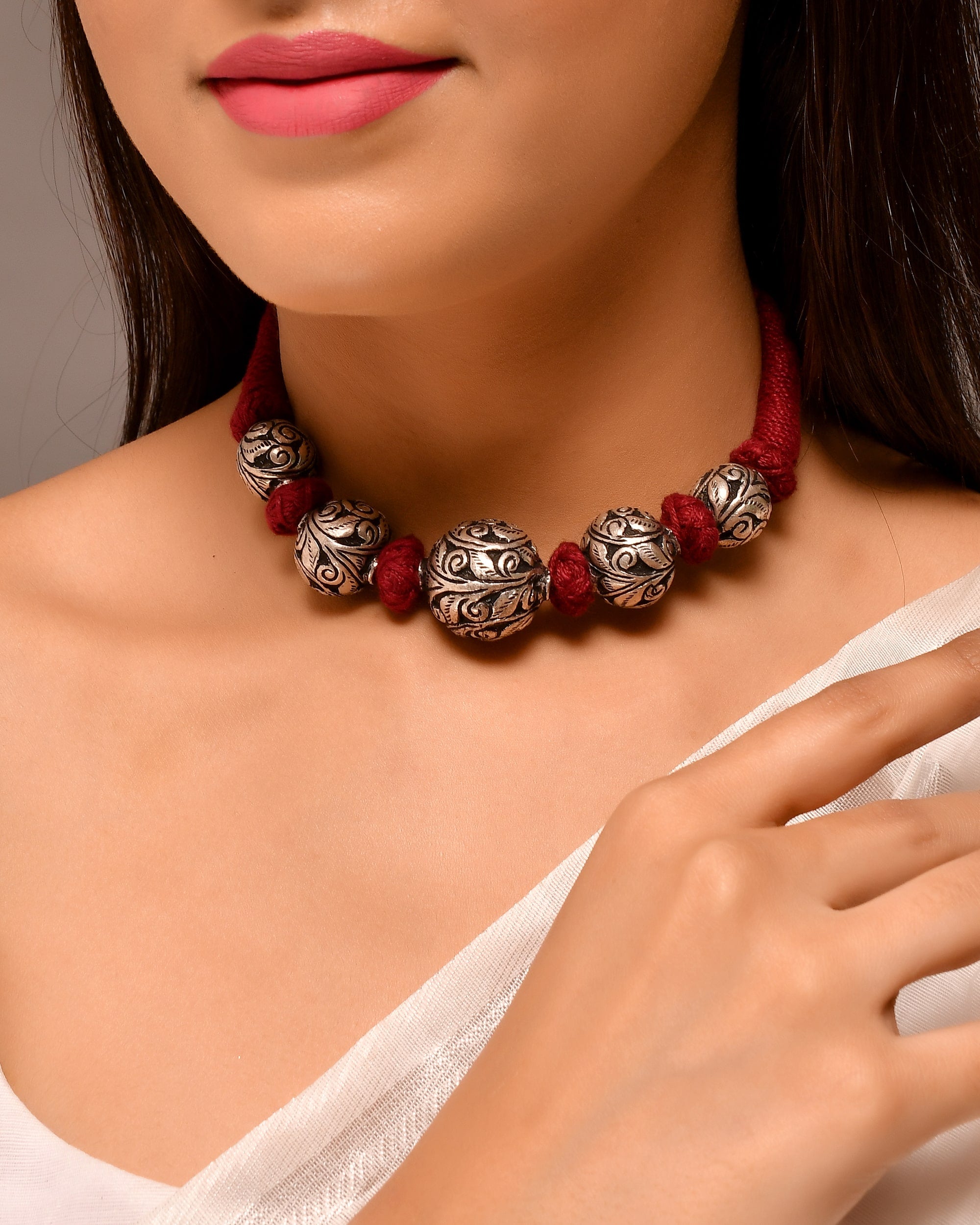 The Gomi beads silver necklace is an intricate piece of jewelry, featuring a delicate strand of silver round balls in a vibrant red thread. The glamorous design will make a subtle yet impressive statement, ideal for any special occasion.