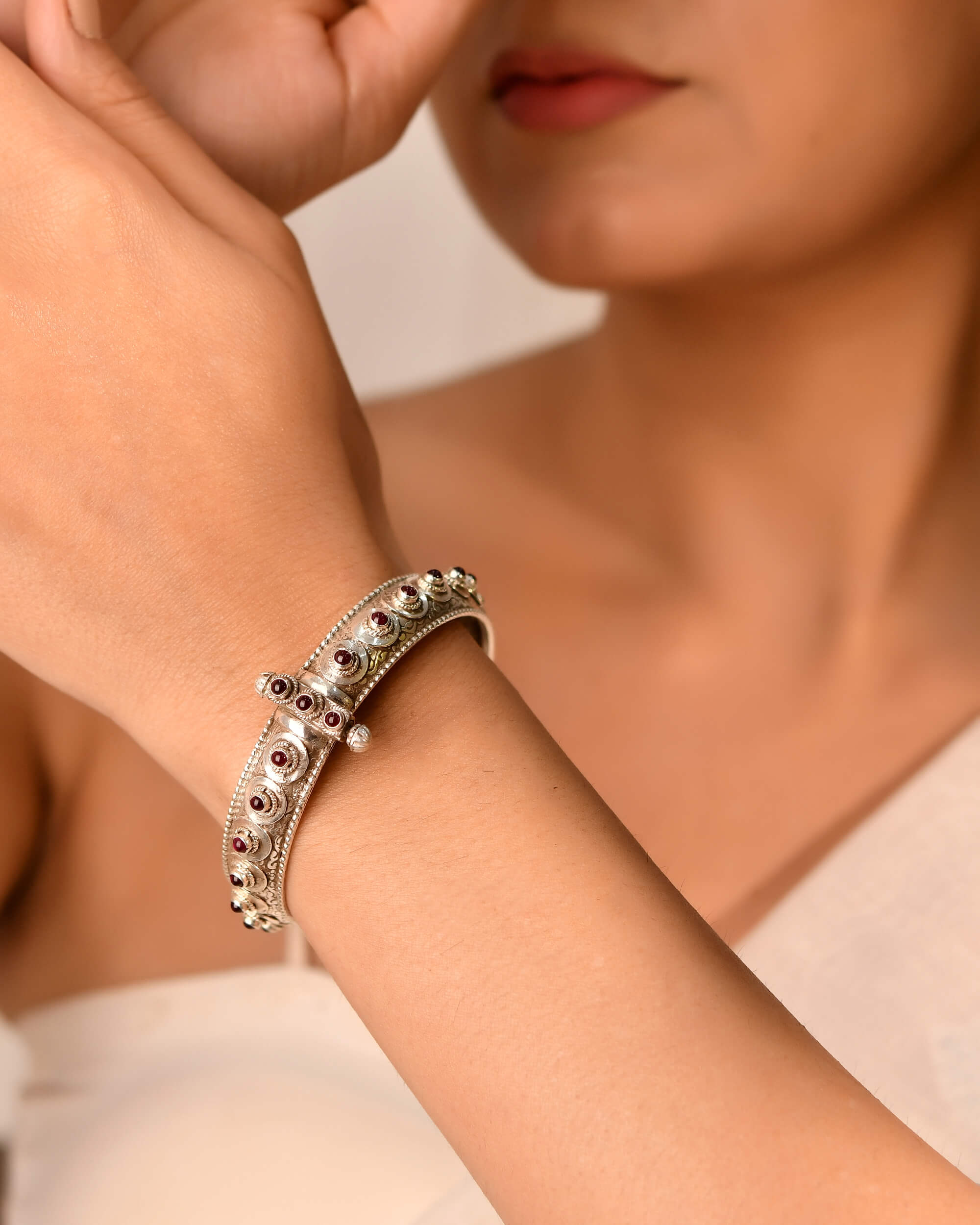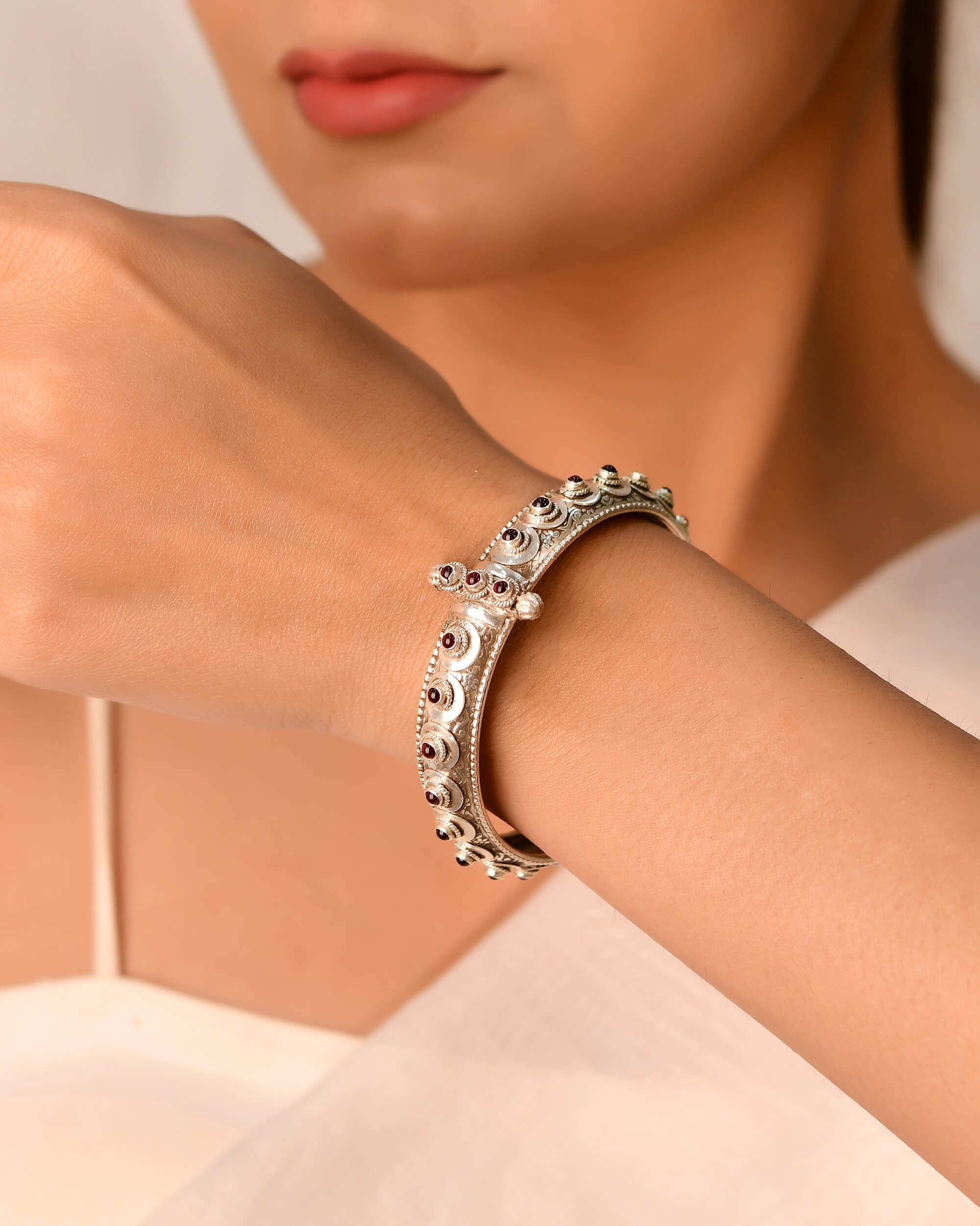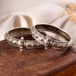Traditional broad kadas featuring carved circular motifs and Red-coloured stones. A regal pair that enhances festive and ethnic looks.