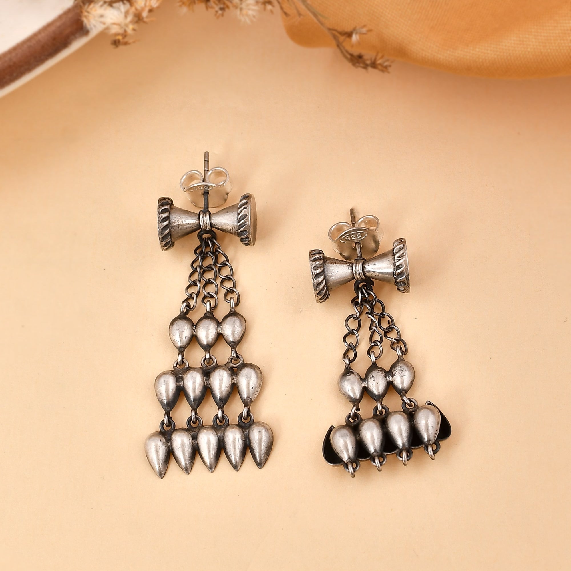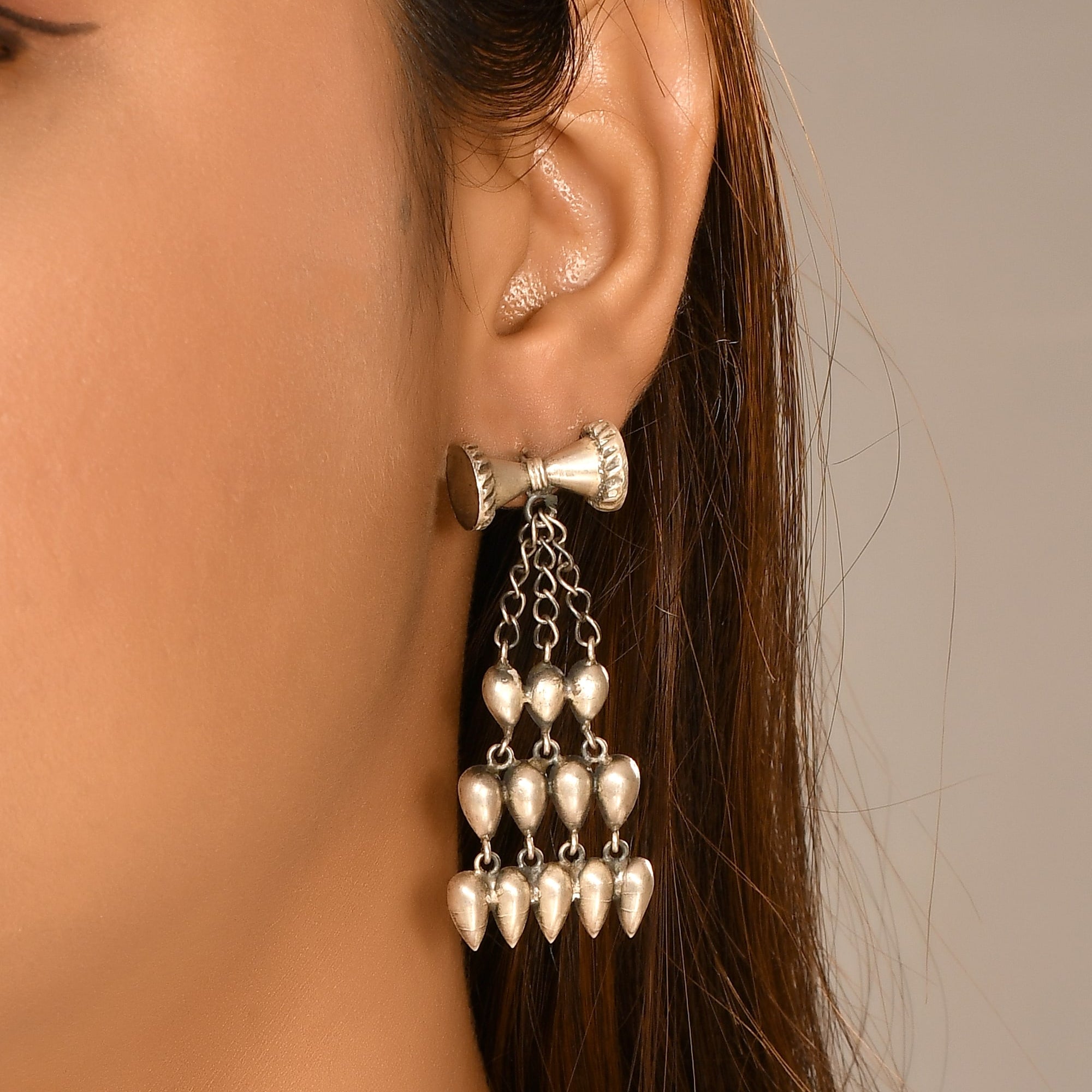 Damru long silver earrings