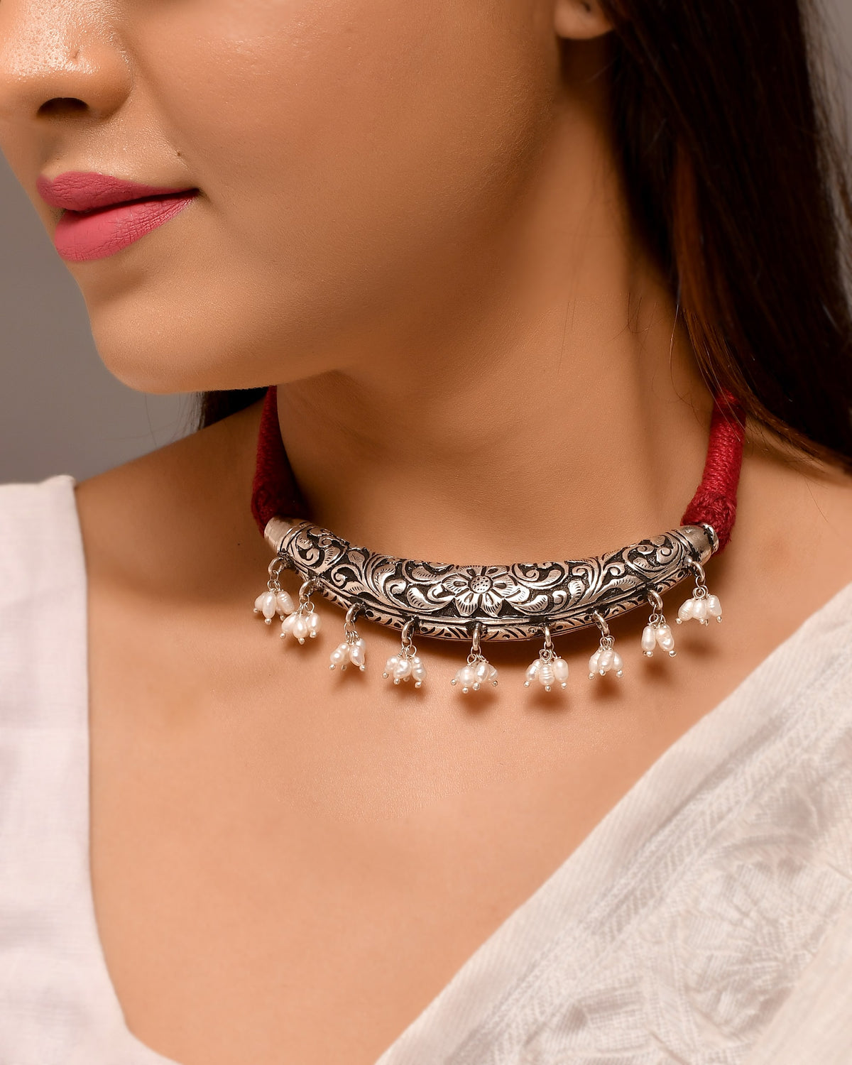This stunning Shankh Silver Necklace features a beautiful design with pearl beads at the bottom. The necklace offers great versatility, as it can be worn either as a long pendant or as a necklace. Get ready to make a statement with this stunning piece.