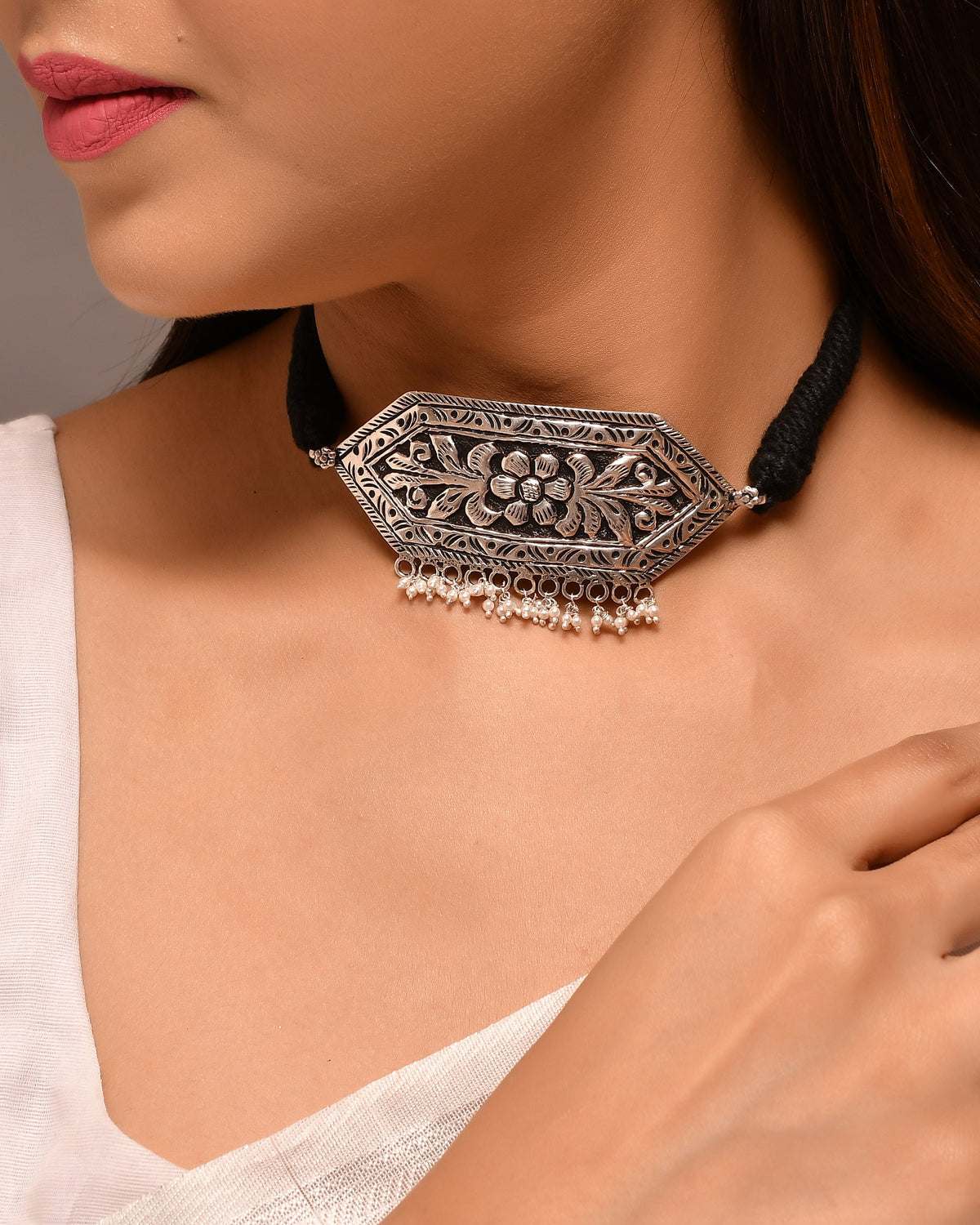This Suryamukh silver chitai necklace features a minimal, classic design that captures an effortlessly chic look. The sterling silver choker is the perfect accessory for any modern bohemian style, elevating your wardrobe with shimmer and glamour.