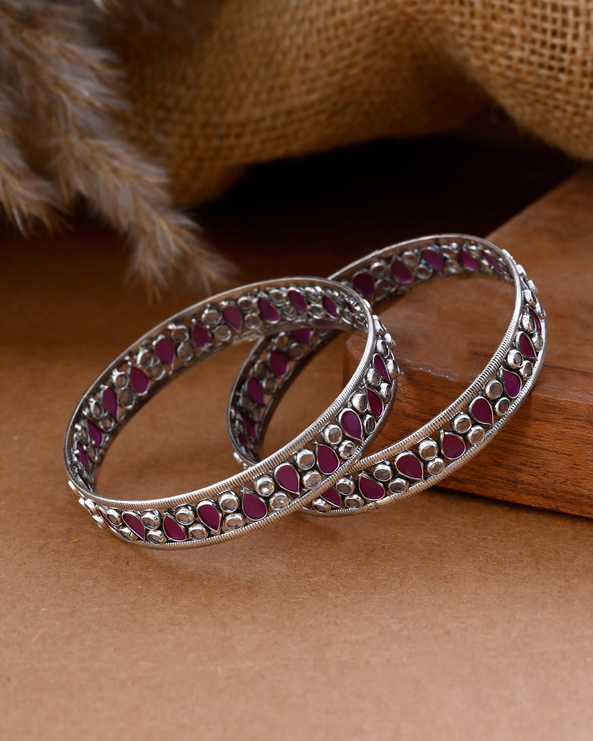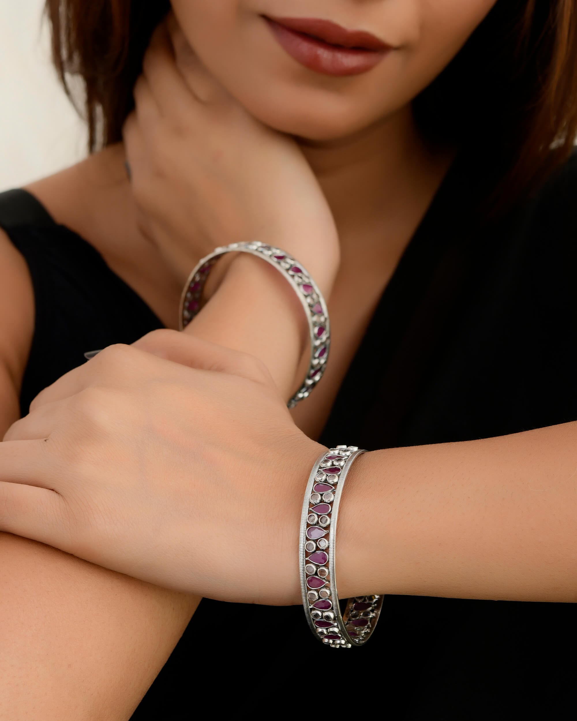 Experience elegance and luxury with the Laal Silver Bangle. Its unique design, crafted with cut stones, adds a touch of sophistication to any outfit. Made with premium quality materials, this bangle is the perfect addition to your jewelry collection. Elevate your style with this timeless piece.