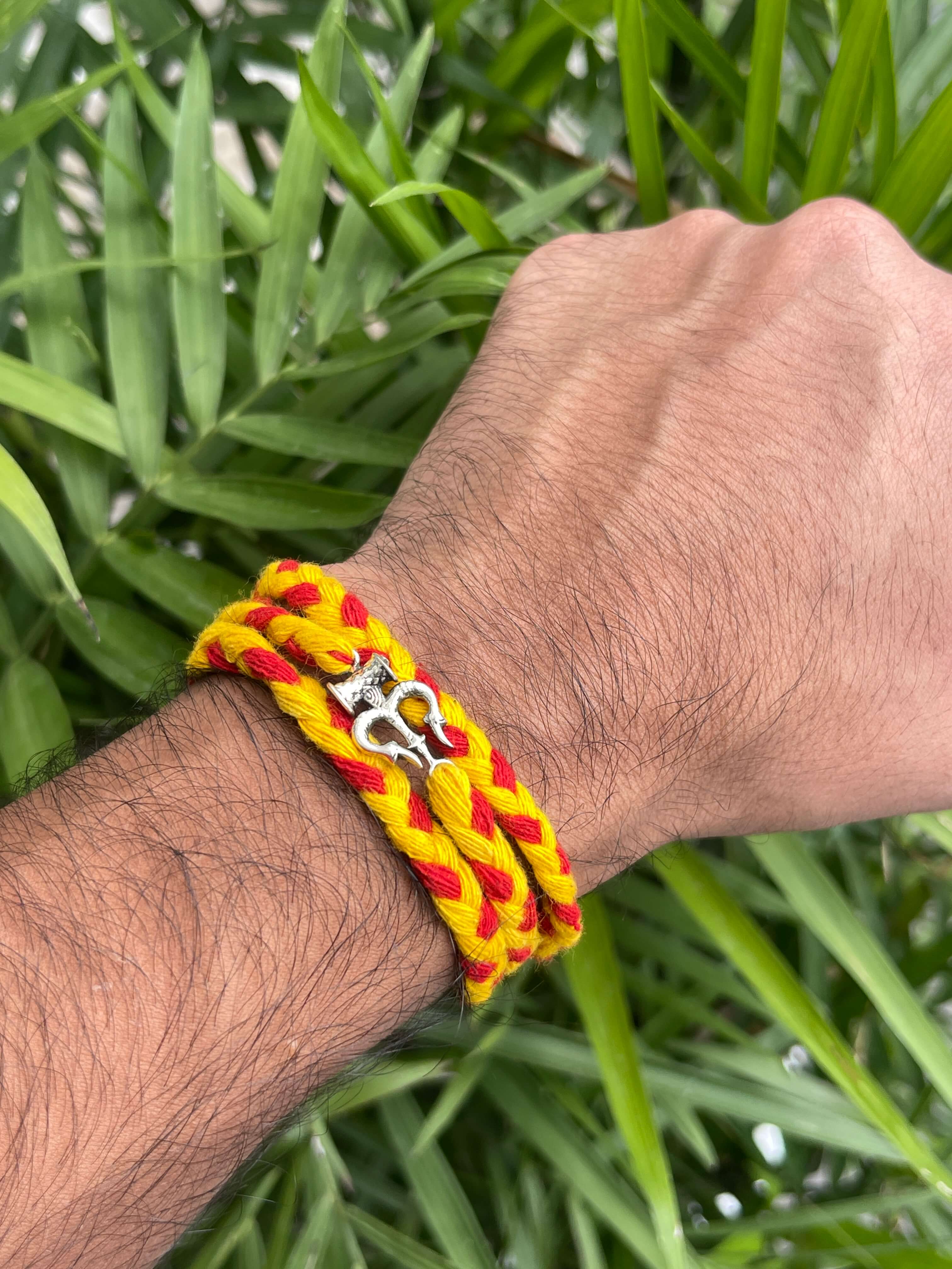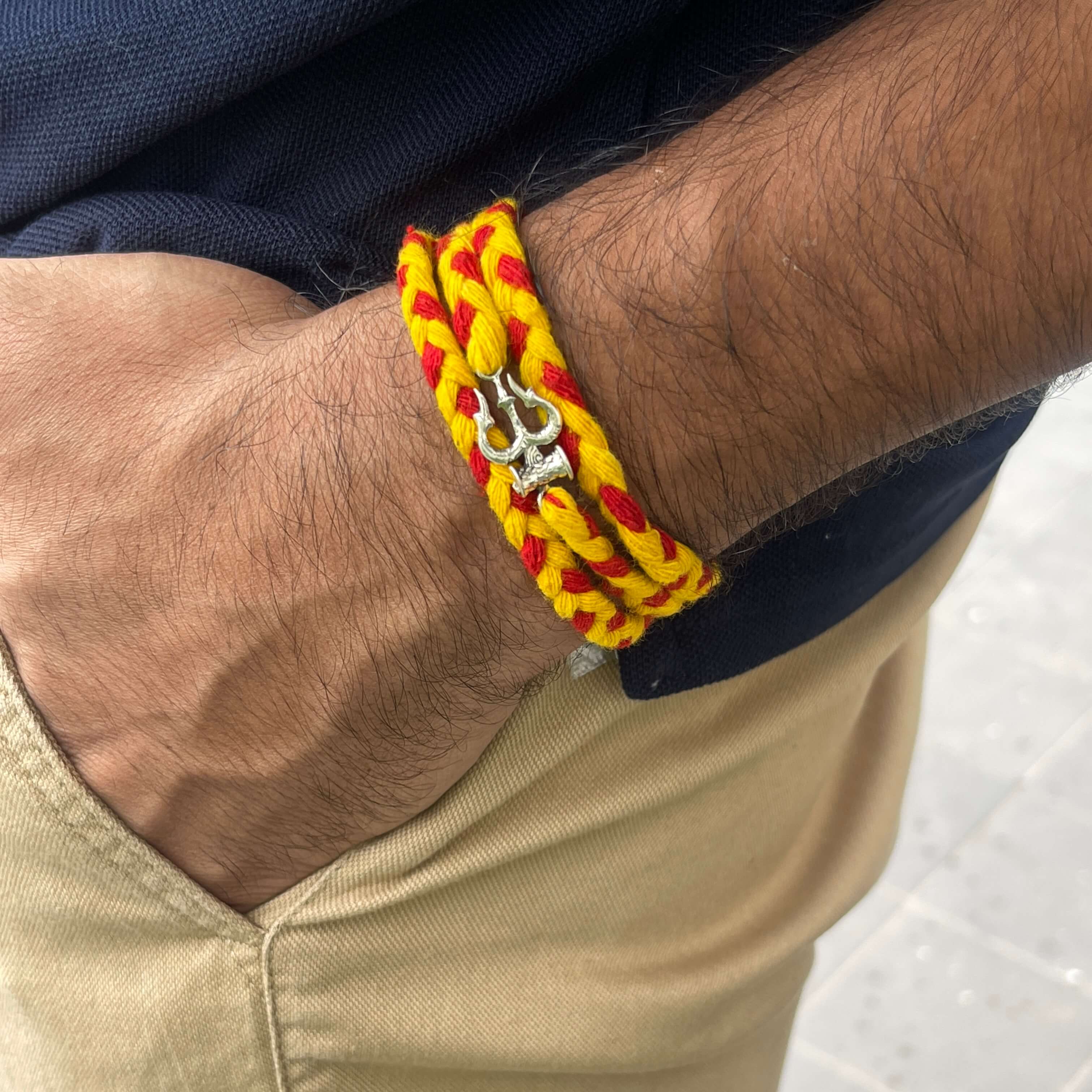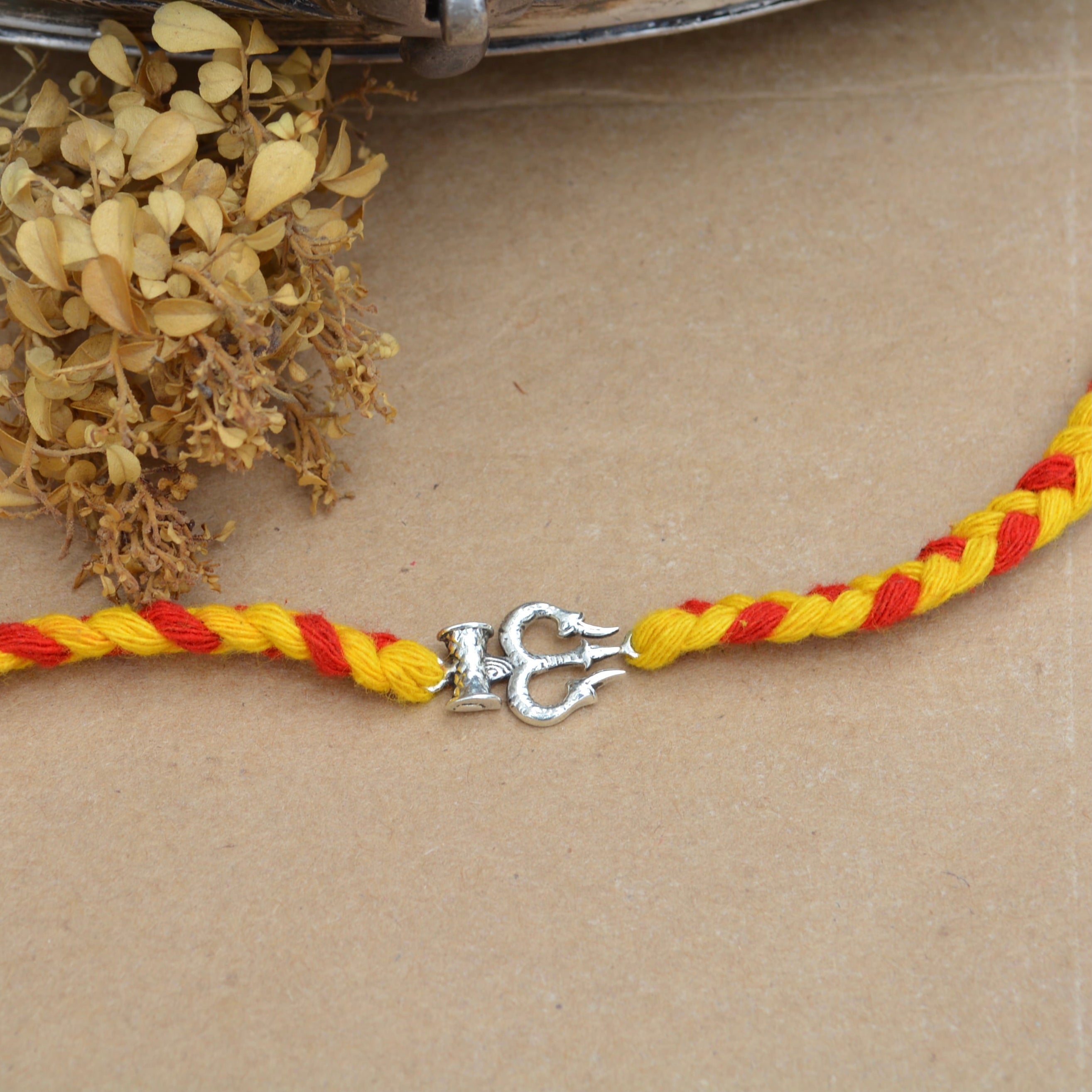 This round rakhi is finely crafted in 92.5 sterling silver. The moli is big in size and will be worn as 3 lines over the wrist